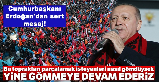 İçeride ve dışarıda terörle mücadelenin devam ettiğini ifade eden Cumhurbaşkanı Erdoğan, “Kandil'de nasıl gömdüysek yine gömmeye devam ederiz. Bizim ülkemizde Kürdistan diye bir yer var mı? Şimdi soruyorum, CHP'nin, Bay Kemal'in el ele, kol kola dolaştığı, sözde İYİ Parti olanlar, kol kola dolaştıkları ne diyor 'Kürdistan'da biz kazanacağız, batıda da AK Parti ile MHP'yi yok edeceğiz'. Bunlar o kadar Kürdistan meraklısıysa Kürdistan Irak'ta, oraya gitsinler! Biz Karadeniz, Akdeniz, Güneydoğu, Orta Anadolu, Ege, Marmara, Trakya'yı toprak edinmişiz. Bu toprakları böldürtmeyiz. Bu toprakları parçalamak isteyenleri nasıl Cudi, Gabar, Tendürek, Kandil'de inlerine gömdüysek yine gömmeye devam ederiz” diye konuştu.“Terör örgütü ile iş tutmak yılanla aynı çuvala girmektir”