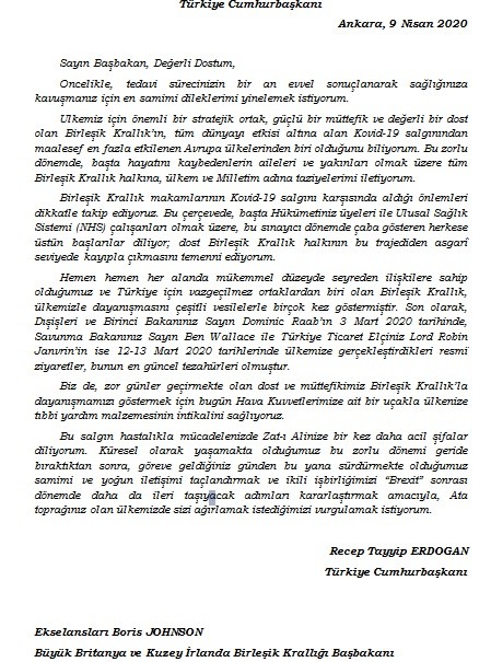 Cumhurbaşkanı Recep Tayyip Erdoğan, bugün Türkiye tarafından tıbbi yardım malzemesi ulaştırılan Birleşik Krallık'ın Başbakanı Boris Johnson'a mektup gönderdi. Cumhurbaşkanı Erdoğan Mektup'ta şu ifadelere yer verdi:“Sayın Başbakan, Değerli Dostum, Öncelikle, tedavi sürecinizin bir an evvel sonuçlanarak sağlığınıza kavuşmanız için en samimi dileklerimi yinelemek istiyorum. Ülkemiz için önemli bir stratejik ortak, güçlü bir müttefik ve değerli bir dost olan Birleşik Krallık'ın, tüm dünyayı etkisi altına alan Kovid-19 salgınından maalesef en fazla etkilenen Avrupa ülkelerinden biri olduğunu biliyorum.Bu zorlu dönemde, başta hayatını kaybedenlerin aileleri ve yakınları olmak üzere tüm Birleşik Krallık halkına, ülkem ve milletim adına taziyelerimi iletiyorum. Birleşik Krallık makamlarının Kovid-19 salgını karşısında aldığı önlemleri dikkatle takip ediyoruz. Bu çerçevede, başta Hükümetiniz üyeleri ile Ulusal Sağlık Sistemi (NHS) çalışanları olmak üzere, bu sınayıcı dönemde çaba gösteren herkese üstün başarılar diliyor; dost Birleşik Krallık halkının bu trajediden asgarî seviyede kayıpla çıkmasını temenni ediyorum. Hemen hemen her alanda mükemmel düzeyde seyreden ilişkilere sahip olduğumuz ve Türkiye için vazgeçilmez ortaklardan biri olan Birleşik Krallık, ülkemizle dayanışmasını çeşitli vesilelerle birçok kez göstermiştir.Son olarak, Dışişleri ve Birinci Bakanınız Sayın Dominic Raab'ın 3 Mart 2020 tarihinde, Savunma Bakanınız Sayın Ben Wallace ile Türkiye Ticaret Elçiniz Lord Robin Janvrin'in ise 12-13 Mart 2020 tarihlerinde ülkemize gerçekleştirdikleri resmî ziyaretler, bunun en güncel tezahürleri olmuştur. Biz de, zor günler geçirmekte olan dost ve müttefikimiz Birleşik Krallık'la dayanışmamızı göstermek için bugün Hava Kuvvetlerimize ait bir uçakla ülkenize tıbbi yardım malzemesinin intikalini sağlıyoruz.Bu salgın hastalıkla mücadelenizde Zat-ı Âlinize bir kez daha acil şifalar diliyorum. Küresel olarak yaşamakta olduğumuz bu zorlu dönemi geride bıraktıktan sonra, göreve geldiğiniz günden bu yana sürdürmekte olduğumuz samimi ve yoğun iletişimi taçlandırmak ve ikili işbirliğimizi ‘Brexit' sonrası dönemde daha da ileri taşıyacak adımları kararlaştırmak amacıyla, ata toprağınız olan ülkemizde sizi ağırlamak istediğimizi vurgulamak istiyorum.”
