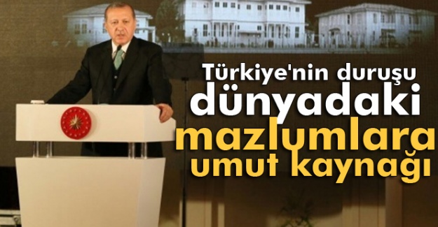 Türkiye'nin dünyanın her yerinde mazlumlar için bir umut kaynağı olduğunu söyleyen Erdoğan, "Türkiye'nin duruşu, dünyanın her yerindeki mazlumlar ve mağdurlar için de bir umut kaynağı olacaktır. Zaten halklar nezdinde bir sıkıntı yok. Sıkıntı başka yerde. Bu bakımdan sorumluluğumuz çok ağır. Kendimizle birlikte bölgemizde ve dünyada üstlendiğimiz misyonun hakkını vermek, millet ve devlet olarak boynumuzun borcudur. Milletimizin tamamının katkılarıyla oluşturulacak bir fon aracılığıyla mübarek üç aylar boyunca Mekke ve Medine'de bulunan dünyanın her köşesinden gelmiş gariplere yardım ulaştıracak bir mekanizmayı da kurabiliriz. Bunun da gayreti içinde olmamız gerekir diye düşünüyorum” ifadelerini kullandı.“Diğer dinlere mensup insanların da emanetlerinin bir yerde bekçiliğini yapıyoruz” diyen Cumhurbaşkanı Erdoğan, “Mukaddes emanetlere olan saygımız, bunların korunması, muhafazası, çok önemli sanat eserlerinin ortaya konulmasına vesile olmuştur. Bu emanetlere kıyamete kadar canımız pahasına sahip çıkmakta, onlara hürmeten yapılan eserleri devam ettirmekte kararlıyız” dedi.