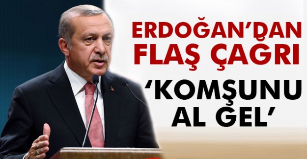 Yurt dışında yaşayan Türk vatandaşlarına, ‘Komşunuzu, dostunuzu alın gelin’ çağrısında bulunan Erdoğan, "Halen yurt dışında yaşayan 5 milyon vatandaşımız var. Bir süre yurt dışında yaşadıktan sonra Türkiye’ye dönerek hayatını burada sürdüren ancak yurt dışı ile bağlantıları halen devam eden 3.5 milyon vatandaşımız bulunuyor. Her yıl ülkelerine sıla-i rahim için gelen vatandaşlarımızın bu güzel geleneği fevkalede değerlidir ve mutlaka devam etmelidir. Şairin dediği gibi: ‘Memleket isterim gök mavi, dal yeşil, tarla sarı olsun; Kuşların, çiçeklerin diyarı olsun. Memleket isterim, ne başta dert ne gönülde hasret olsun. Memleket isterim, yaşamak, sevmek gibi gönülden olsun.’ Türkiye işte böyle bir memlekettir. Dünyanın neresine giderse gitsin hiçbir vatandaşımız ülkesi ile bağını kopartmaz. Biz yurt dışındaki vatandaşlarımızın tamamını aynı zamanda ülkemizin fahri turizm elçileri olarak da görüyoruz. Yurt dışında yaşayan vatandaşlarımızı, sıla-i rahim ziyaretine ilave olarak aileleri ile birlikte ülkemizde tatil yapmaya davet ediyorum. Akrabalarını ziyaret eden vatandaşlarımız, izinlerinden en azından bir haftasını da Türkiye evimiz, vatanımızı tanıyalım anlayışı ile turizme ayırmalıdır. Vatandaşlarımızdan sadece kendileri gelmekle kalmayıp, yaşadıkları ülkelerdeki komşularını, dostlarını, arkadaşlarını da ülkemize davet etmelerini istiyorum. Yurt dışındaki vatandaşlarımıza yönelik olarak ‘Komşunu al gel’ kampanyasını başlatıyoruz. Türkiye, yurt dışındaki vatandaşlarımızın çevrelerindeki herkese, ‘Türkiye dünyanın en misafirperver ülkesidir, tatil için sizde gelin’ demelerini sağlayacak güzelliklere ziyadesiyle sahiptir" dedi.