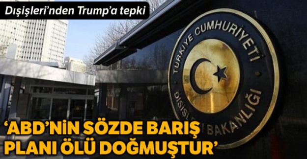 Dışişleri Bakanlığı, ABD Başkanı Donald Trump'ın açıkladığı Ortadoğu planına sert tepki gösterdi.Dışişleri'nden yapılan açıklamada, "ABD'nin sözde barış planı ölü doğmuştur. Bu plan, iki devletli çözümü öldürmeyi ve Filistin topraklarını gasp etmeyi hedefleyen bir ilhak planıdır. Filistin halkı ve toprakları parayla satın alınamaz. Kudüs kırmızı çizgimizdir. İsrail'in işgal ve zulmünü meşrulaştırmaya yönelik adımlara izin vermeyeceğiz. Kardeş Filistin halkının daima yanında olacağız. Filistin topraklarında bağımsız Filistin için çalışmaya devam edeceğiz. Filistin'in kabul etmeyeceği hiçbir planı desteklemeyeceğiz. İşgal politikalarına son vermeden Ortadoğu'ya barış gelemez” ifadelerine yer verildi.