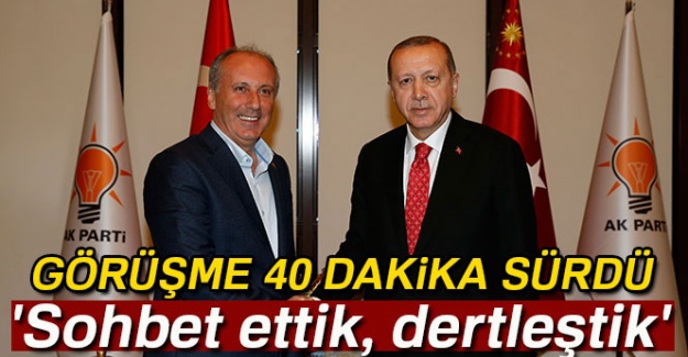 Randevu talebi Muharrem İnce’den gelirken, Erdoğan, İnce’yi Cumhurbaşkanlığı Külliyesi yerine AK Parti Genel Merkezinde kabul etti. İnce, CHP Grup Başkanvekili Engin Altay ile birlikte AK Parti Genel merkezine gelirken, parti girişinde AK Parti Grup Başkanvekili Mustafa Elitaş karşıladı.40 dakika süren görüşme sonrasında bir açıklama yapan Muharrem İnce, “Sayın Genel Başkanı ve AK Parti’ye, partisine başarılar diledik, sohbet ettik, dertleştik” diye konuştu. İnce, soruları cevaplamadan AK Parti Genel Merkezinden ayrılırken, gazetecilerin sorularına cevap veren AK Parti Grup Başkanvekili Mustafa Elitaş ise “Sayın Cumhurbaşkanımızla CHP cumhurbaşkanı adayı Sayın İnce ve Grup Başkanvekili Altay birlikte geldiler, güzel bir sohbet oldu, birbirlerine başarılar dilediler. Güzel bir sohbet oldu, ikisi de Rizeliymiş” ifadelerini kullandı.