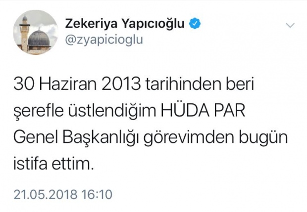 Zekeriya Yapıcıoğlu sosyal medya hesabından yaptığı açıklamada "30 Haziran 2013 tarihinden beri şerefle üstlendiğim HÜDA PAR Genel Başkanlığı görevimden bugün istifa ettim." dedi.