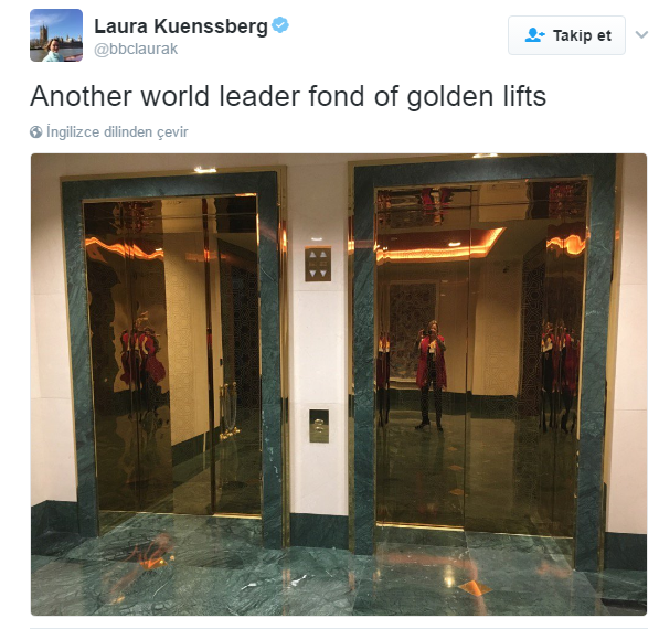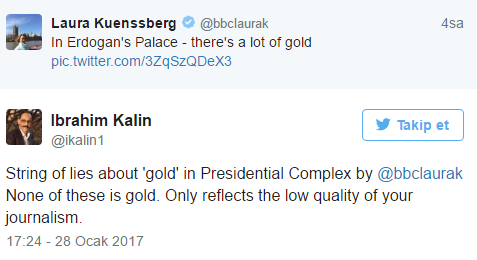 Cumhurbaşkanlığı Genel Sekreter Yardımcısı ve Sözcüsü İbrahim Kalın, Cumhurbaşkanlığı Külliyesi'nde çok fazla altın olduğu iddiasını sosyal medyadan paylaşan bbc muhabiri Laura Kuenssberg'a Twitter hesabından, "Bunların hiçbiri altın değil. Yaptıkların sadece gazeteciliğinin düşük kalitesini gösteriyor" ifadesiyle yanıt verdi.'ÇOK FAZLA ALTIN VAR'Cumhurbaşkanlığı Sözcüsü Kalın, bugün İngiltere Başbakanı Theresa May'in ziyaretini takip etmek üzere Cumhurbaşkanlığı Külliyesi'ne gelerek basın toplantılarının yapıldığı salonda çektiği fotoğrafı, "Erdoğan'ın sarayındayım. Çok fazla altın var" mesajıyla sosyal medyada paylaşan BBC muhabiri Laura Kuenssberg'e Twitter hesabından cevap verdi.