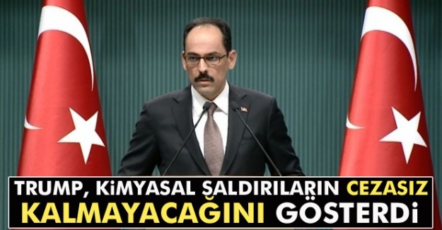 Cumhurbaşkanlığı Sözcüsü İbrahim Kalın, ABD’nin Suriye rejimine ait hava üssünü vurmasına ilişkin değerlendirmede bulunarak, ABD Başkanı Trump’ın Esed rejimine misilleme yaparak bundan sonra kimyasal saldırıların cezasız kalmayacağını ortaya koyduğunu belirtti.