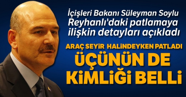 İçişleri Bakanı Süleyman Soylu, Reyhanlı'daki patlamaya ilişkin yaptığı açıklamada şunları söyledi;Hatay'ın Reyhanlı ilçesinde bir araçta patlama meydana geldi. Patlamaya ilişkin açıklama yapan İçişleri Bakanı Süleyman Soylu, olayla ilgili soruşturmanın devam ettiğini aktardı. Soylu, "Seyir halindeki bir aracın içerisinde biz el yapımı patlayıcı (EYP) olduğunu düşünüyoruz. Tabi bunun için laboratuvar çıktılarına, gelecek sonuca ihtiyacımız var. Üçünü de kimliği belli, üçü de geçici koruma kapsamında geçici kimliği ile beraber Türkiye'de yaşayan Suriyeliler. İkisi hayatını kaybetti birisi de şu anda ağır yaralı.Araç seyir halindeyken patladı, içerisindeki EYP'nin zaman ayarı veya başka bir dış etken veya iç etkenden kaynaklanmış olabilir ama olayla ilgili tam soruşturma ve tüm bilgiler veriler değerlendiğinde kamuoyu ile paylaşılacaktır" şeklinde konuştu.Etrafta herhangi bir hasar söz konusu olmadığını belirten Soylu, "En yakınındaki arabada bile en ufak bir hasar söz konusu değildir. İlgili tüm bağlantılarla ilgili de arkadaşlarımız çalışıyorlar. Elde edilen bir takım bilgiler ve veriler var bunlar netleştiğinde kamuoyu ile paylaşılacaktır" diye konuştu.