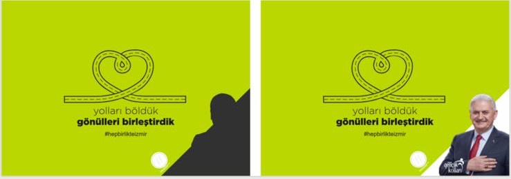 YOLLARI BÖLDÜK GÖNÜLLERİ BİRLEŞTİRDİKYol resmi ile kalp oluşturulan üçüncü kartpostal serisinde ise önce “Yolları Böldük, Gönülleri Birleştirdik” sloganı göze çarpıyor. Kartpostalın köşesindeki gri zemin kazıldığında ise Başbakan Binali Yıldırım’ın resmi ortaya çıkıyor.Kampanyanın büyük yankı uyandırdığını belirten İzmir İl Gençlik Kolları Başkanı Eyüp Kadir İnan, “Seçimlere yönelik mesajımızı verirken aynı zamanda genç seçmenlerimizin yüzünü de tebessüm ettirmek istedik” dedi.