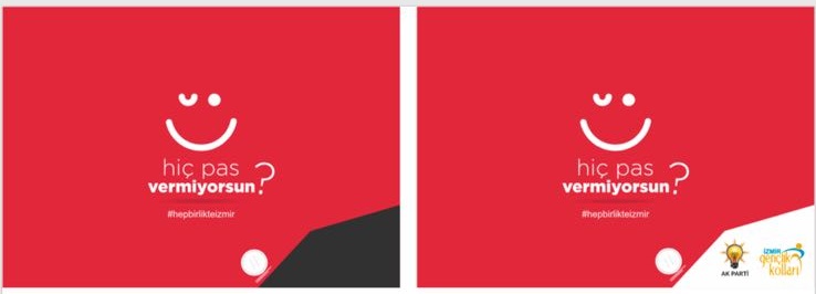 HİÇ PAS VERMİYORSUN?AK Parti’nin oy oranının düşük olduğu İlçelerdeki gençlere gönderilen ikinci kartpostal serisinde ise “hiç pas vermiyorsun?” yazıyor. #hepbirlikteizmir hashtag'inin de yer aldığı kartpostalın gri alanı kazıldığında yine Ak Parti ve Gençlik Kolları logosu beliriyor.