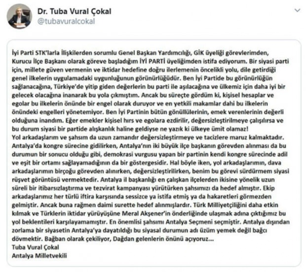 İYİ Parti Antalya Milletvekili Tuba Vural Çokal partisinden istifa ettiğini duyurdu. İstifasını sosyal medya hesabı üzerinden gece saat 02.00'de duyuran Tuba Vural Çokal, yol arkadaşları ve kendisinin uzun zamandır değersizleştirilmeye maruz kaldığını, Antalya’da kongre sürecine gidilirken, Antalya’nın iki büyük ilçe başkanın görevden alınmasının da bu durumun bir sonucu olduğu gibi, demokrasi vurgusu yapan bir partinin kendi kongre sürecinde adil ve eşit bir ortamı sağlayamadığının da bir göstergesi olduğunu söyledi.DEĞERSİZLEŞTİRME İDDİASITuba Vural Çokal, sosyal medya üzerinden yaptığı açıklamada şu ifadeleri kullandı:“İYİ Parti STK’larla İlişkilerden Sorumlu Genel Başkan Yardımcılığı, GİK üyeliği görevlerimden, Kurucu İlçe Başkanı olarak göreve başladığım İYİ Parti üyeliğimden istifa ediyorum. Bir siyasi parti için, millete güven vermenin ve iktidar hedefine doğru ilerlemenin öncelikli yolu, dile getirdiği genel ilkelerin uygulamadaki uygunluğunun görünürlüğüdür. Ben İYİ Parti'de bu görünürlüğün sağlanacağına, Türkiye’de yitip giden değerlerin bu parti ile aşılacağına ve ülkemiz için daha iyi bir gelecek olacağına inanarak bu yola çıkmıştım. Ancak bu süreçte gördüm ki, kişisel hesaplar ve egolar bu ilkelerin önünde bir engel olarak duruyor ve en yetkili makamlar dahi bu ilkelerin önündeki engelleri yönetemiyor. Ben İYİ Parti'nin bütün gönüllülerinin, emek verenlerinin değerli olduğuna inandım. Eğer emekler kişisel hırs ve egolara ezdirilir, değersizleştirilmeye çalışılırsa ve bu durum siyasi bir partide alışkanlık haline geldiyse ne yazık ki ülkeye ümit olamaz. Yol arkadaşlarım ve şahsım da uzun zamandır değersizleştirmeye ve tacizlere maruz kalmaktadır.