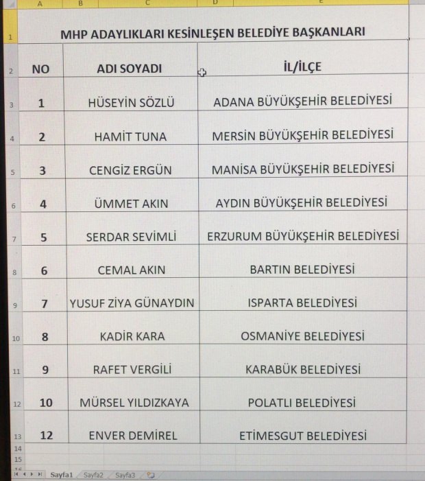 MHP, Adana Büyükşehir Belediye Başkanlığı için mevcut Belediye Başkanı Hüseyin Sözlü, Mersin Büyükşehir Belediye Başkanlığı için Toroslar Belediye Başkanı Hamit Tuna, Manisa Büyükşehir Belediye Başkanlığı için mevcut Belediye Başkanı Cengiz Ergun, Aydın Büyükşehir Belediye Başkanlığı için Germencik Belediye Başkanı Ümmet Akın, Erzurum Büyükşehir Belediye Başkanlığı için Serdar Sevimli'yi aday gösterecek.MHP Yerel Yönetimlerden Sorumlu Genel Başkan Yardımcısı Sadir Durmaz, yerel seçimlere ilişkin şu açıklamayı yaptı:"Her yer için çalışmalarımız devam ediyor. Çok sayıda sürpriz aday söz konusu olabilir. Parti içinden, dışarıdan, sevilen sayılan, partimizin ilkelerini benimsemiş üretken belediyecilik anlayışını benimsemiş çok sayıda aday adayı ihtiyacımız var. Bundan önceki seçimlerde olduğu gibi bu seçimlerde de aday adaylarından bir ücret talebi söz konusu değildir."