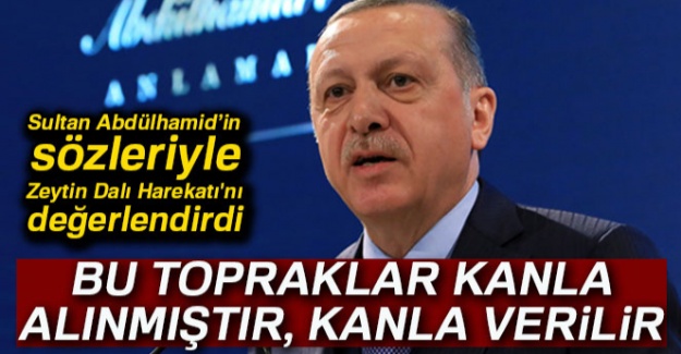 Sultan Abdülhamid’in sözleriyle konuşmasını sürdürün Cumhurbaşkanı Erdoğan, "Bu millet onu, hele hele bu dönemdi burası çok önemli tam bu dönemde ‘Ben bir karış dahi olsa vatan toprağını satmam, zira bu vatan bana değil, milletime aittir. Milletimde bu toprakları aldığı fiyata verir. Bu topraklar kanla alınmıştır, kanla verilir’ tespiti ve resti ile hatırlıyor. İşte Kudüs, bu ara Kudüs’ü yaşadık. Olay bu kadar açık ve net ortadır. Değerli arkadaşlar şu anda biz Afrin’de bunun için varız. Öyle sıradan bu iş rastgele bir olay değil. Milletimizin gönlünde böylesine müstesna bir makama sahip olan Sultan Abdülhamid’e artık yeminli düşmanlarının kalıplarından bakmaktan herkesin vazgeçmesi gerekir. 33 yıllık hükümranlığı boyunca ayağına bastıklarının iftira ve yalanları üzerinden ona güftan edenlerin devri artık kapanmıştır. Tarihi hakikatleri kabul etmek yerine onu kendi ideolojisine göre yazma teşebbüsleri artık başarısızlığa uğramıştır. Sultan 2’nci Abdülhamid’e ve onun mirasına tarafsız ve önyargısız ahlaklı bir şekilde yaklaşabilenler için ortada gerçekten göz kamaştırıcı bir hazine vardır" ifadelerini kullandı.