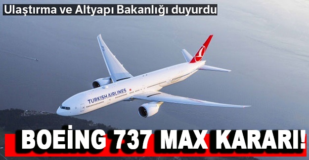 Ulaştırma ve Altyapı Bakanlığı, Boeing 737 MAX 8 ve/veya Boeing 737 MAX 9 tipi hava araçlarının uçuşlarının, uçuş emniyetini teminen tedbir amaçlı olarak ikinci bir karara kadar durdurulduğunu açıkladı.
