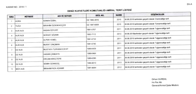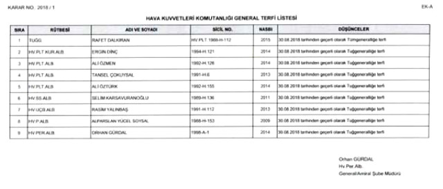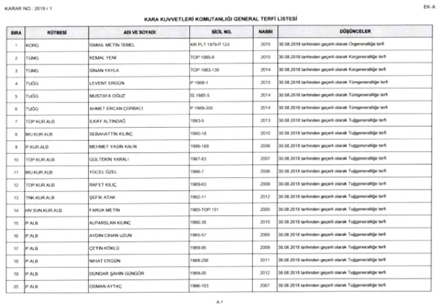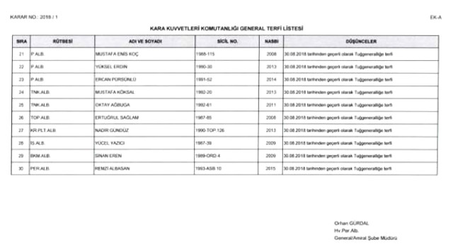 Cumhurbaşkanlığı Hükümet Sistemi'nin ilk Yüksek Askeri Şura toplantısı yapıldı. Cumhurbaşkanı Erdoğan'ın başkanlığında yapılan toplantı 2,5 saat sürdü.Cumhurbaşkanlığından toplantısı sonrası yapılan açıklamaya göre;383 ALBAYIN GÖREV SÜRELERİ 2 YIL UZATILDI30 Ağustos 2018 tarihinden geçerli olmak üzere 9 general/amiral bir üst rütbeye, 41 albay ise general/amiralliğe yükseltildi. 13 generalin görev süreleri 1 yıl, 383 albayın görev süreleri 2 yıl süreyle uzatıldı.İSMAİL METİN TEMEL PAŞA, ORGENERALLİĞE YÜKSELDİ12 general/amiral kadrosuzluktan emekliye sevk edilmiştir. 215 olan general/amiral sayısı 244 olacaktır. Deniz Kuvvetleri Komutanı Koramiral Adnan Özbal oramiralliğe, 2. Ordu Komutanı Korgeneral İsmail Metin Temel orgeneralliğe, tümgeneral Kemal Yeni ve tümgeneral Sinan Yayla korgeneralliğe, tuğgeneral Levent Ergün tuğgeneral Mustafa Oğuz, tuğgeneral Ahmet Ercan Çorbacı tümgeneralliğe, İbrahim Özdem Koçer tümamiralliğe, Rafet Dalkıran tümgeneralliğe terfi ettirildi.Cumhurbaşkanlığı, Yüksek Askeri Şura kararlarında alınan terfi listesinin tamamını internet sitesinde yayımladı.
