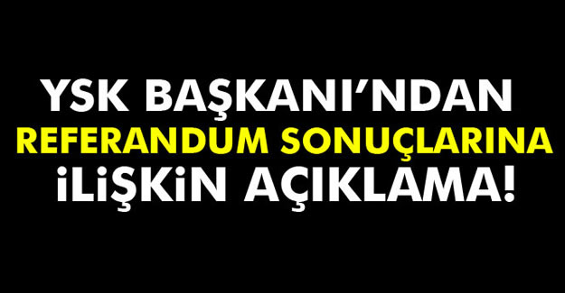 YSK Başkanı Sadi Güven, referandum sonuçlarına dair açıklama yaptı. Oyların büyük oranda sayıldığını kaydeden Güven, “Halk oylamasıyla ilgili kurulumuz tarafından bilgilendirme mesajı almak isteyenlere e-posta ve SMS ile bilgilendirme mesajı yolladık. İl ve ilçe merkezlerinde bina sorumlusu görevlendiren yerlerde seçim torbalarını, oy verme günü saat 05.00 itibariyle teslim ettik. Böylece istenmeyen görüntülerin de önüne geçtik” diye konuştu.