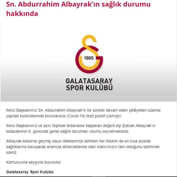 Galatasaray, 2. Başkanı Abdurrahim Albayrak'ın sağlık durumu ile ilgili bir açıklama yaptı. Yapılan açıklamada Albayrak ve eşinin korona virüs testinin pozitif çıktığı ve tedavilerinin olumlu yönde seyrettiği bildirildi.Son günlerde Galatasaray 2. Başkanı Abdurrahim Albayrak hakkında çıkan korona virüs haberleri ile ilgili sarı-kırmızılı kulüpten resmi bir açıklama geldi. Sosyal medya hesabından yapılan açıklamada Albayrak ve eşinin korona virüs testinin pozitif çıktığı belirtilirken şu ifadelere yer verildi:"İkinci Başkanımız Sn. Abdurrahim Albayrak'ın bir süredir devam eden şikâyetleri üzerine yapılan kontrollerinde koronavirüs (Covid-19) testi pozitif çıkmıştır. İkinci Başkanımız ve aynı teşhisle tedavisine başlanan değerli eşi Şükran Albayrak'ın tedavilerinin 6. gününde genel sağlık durumları olumlu seyretmektedir. Albayrak Ailesi'ne geçmiş olsun dileklerimizi iletirken her ikisinin de en kısa sürede sağlıklarına kavuşarak aramıza döneceklerine olan inancımızın tam olduğunu belirtmek isteriz."