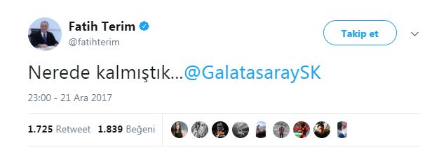 Igor Tudor'un ayrılmasının ardından Galatasaray'ın teknik direktörü efsane isim fatih terim oldu... Terim, Galatasaray'la anlaşmaya vardığını bizzat kendisi duyurdu. Deneyimli hoca, kişisel Twitter hesabı üzerinden Galatasaray'ın hesabını etiketleyerek, "Nerede kalmıştık?" ifadesini kullandı...Galatasaray Kulübü, Fatih Terim ile görüşmelere başlandığını borsaya bildirdi.