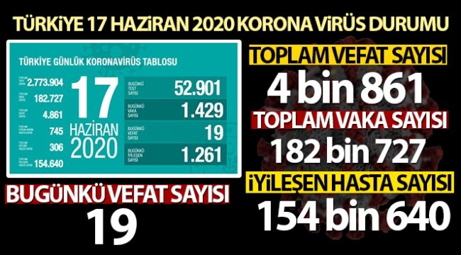 Sağlık Bakanlığından yapılan açıklamaya göre, son 24 saatte 19 kişi korona virüsten hayatını kaybetti, toplam can kaybı ise 4 bin 861'e yükseldi. Bugün toplam 52 bin 901 test yapılırken, bin 429 yeni vaka tanısı konuldu, toplam vaka sayısı ise 182 bin 727 oldu. Bugünkü bin 261 kişiyle birlikte toplam iyileşen sayısı da 154 bin 640'e yükseldi. Toplam entübe hasta sayısının 306, toplam yoğun bakım hasta sayısının ise 745 olduğu açıklandı.